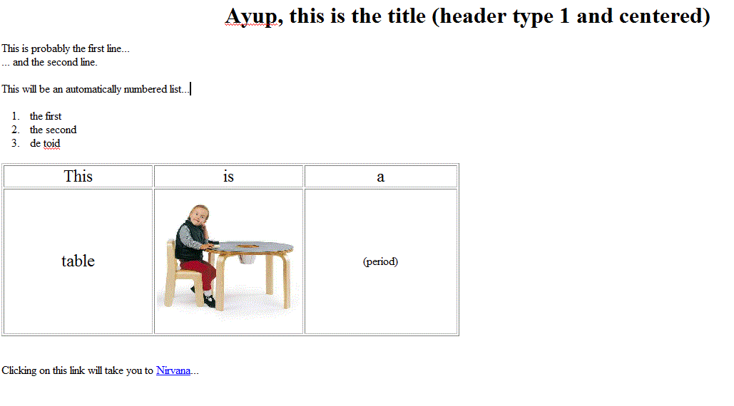 | Create a simple web page. Due: Wed. 2/10 (2./11 for period 8) midnight | You should create an HTML page on your home computer that looks somewhat like this. It has to have a table, at least an embedded picture, and at least one link. Upload this html page to your public_html directory, and put a link to it in the Comments-to-Teacher box of the homework slot. Instructions on how to do this are here: Uploading to Stuy. After you have done so, go back to the View Homework menu option, and try clicking on the link you've submitted to me. If it works, you're fine. If not, fix it -- I do not want to click on your link and see nothing, or some error message. |