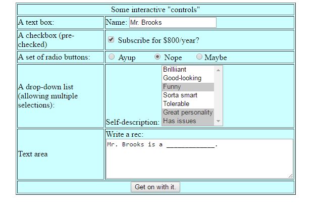 | Interaction on the web | Here's my Guide for HTML Interaction: Here's a picture of a sample web page. Try to duplicate it. When you do, use the following form-tag: <form method="get" action="http://homer.stuy.edu/~pbrooks/allcgi.py"> For me, pressing the button gave me back the following output: Variables and values sent:like_rad=Nope Here is the python program allcgi.py. |